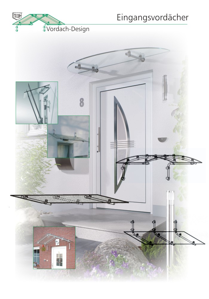 Es handelt sich bei unseren Eingangsvordächern um variabel einsetzbare Systeme, die Ihnen die Möglichkeit einer individuellen Gestaltung geben. Sie können aus unseren Komplettangeboten wählen oder aber auch Einzelteile kaufen bzw. nachkaufen.